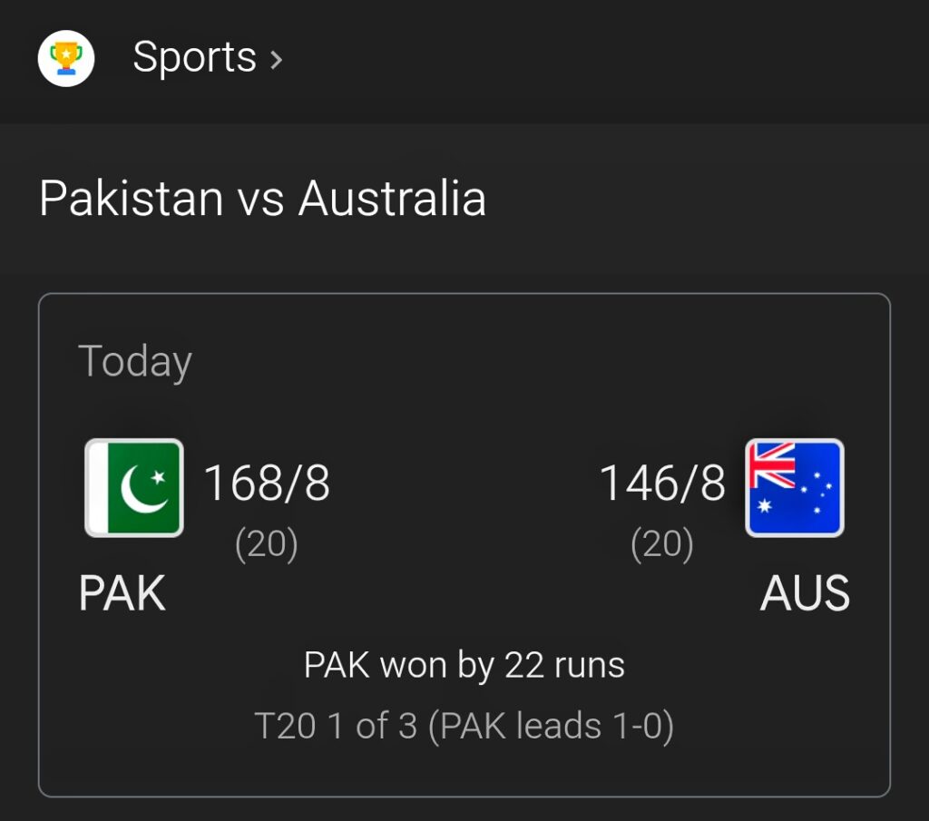 Pakistan vs Australia 1st T20 final result, Pakistan lead (1-0) won by 22 runs , Pakistan give 168/8 in 20 overs , when Australia chasing the 168 runs , Australia 146/8 runs , final result Pakistan beat Australia 1st T20 cricket match .