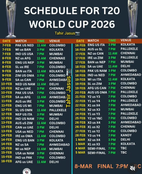 T20 World Cup 2026 Schedule 777The complete match schedule of the **ICC T20 World Cup 2026** is out, featuring blockbuster clashes, high-voltage India vs Pakistan match, group stage battles, semi-finals and the grand final. Matches will be played across iconic venues with day and night games adding extra excitement for cricket fans worldwide. Save this post to never miss a match and stay updated with all fixtures, dates and venues.